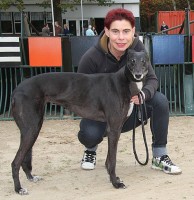 Op het 1e plan is vanuit een kikkerperspectief frontaal de torso van een hond te zien. De zwarte ‘hazewind’ met witte bef domineert met op geheven hoofd van links driekwart tot rechtsonder het beeld. Zowel de vorm van de witte bef als de glans op de vacht, grijze partijen in de zwarte vacht geven de hond diepte. De vlakken zijn egaal, zonder penseelstreek geschilderd. De zwarte vorm van de hond wordt omlijnd door een witte contour die geleidelijk opgaat in de achtergrond.