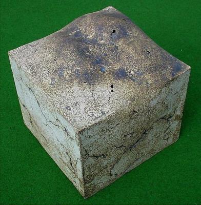 Serie `DESERT-CUBES` ceramic boxes... Holle, dunwandige keramische dozen, door middel van een meerdere malen herhaald bakproces ontstaan. De `dozen` zijn afgeleid van `zoden` die uit het denkbeeldig oppervlak van een ruig woestijnachtig landschap lijken te zijn gestoken. De bovenvlakken zijn ruig, aangetast, opengebarsten, er dringen objecten door of er liggen objecten óp. De zijvlakken zijn misvormd als door inwendige spanningen. Engobes, alsmede oxide- en lichte glazuuraccenten versterken het aardse karakter.