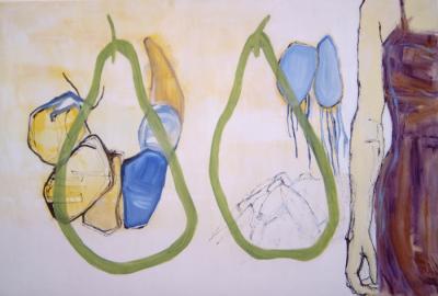 Dit is een werk wat tijdens het schilderen voornamelijk is ontstaan. Het belangrijkste en opvallendste element, de peren, zijn toegevoegd op een moment dat ik het schilderij eigenlijk al tot af verklaard had, maar nog niet het gevoel had m'n doel bereikt te hebben. De peren zorgen voor een vreemde onwerkelijkheid erin, en maken dat je net iets langer naar dit werk blijft kijken.