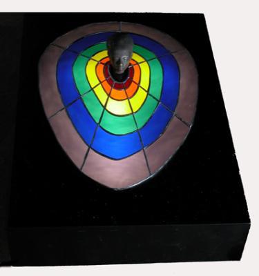 Een gevonden bronzen hoofdje kijkt uit over een regenboog van glas. Het kopje is geplaatst op een tiffany-raam, wat een eigen lichtbron heeft. Het glasobject moet staan en kan niet tegen een muur aangeplaatst worden