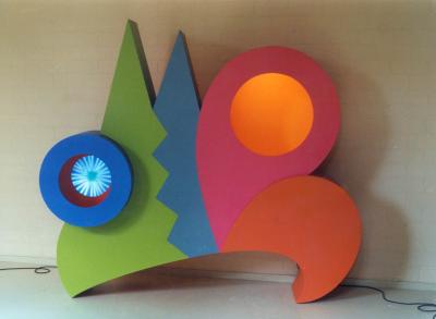 Groot, kleurig object met verborgen functies:verlichte lade achter de oranje halve cirkel rechtsonder. Beweegbare 'lichtrol'links ( blauw).Verlichte gele cirkel is een open vitrineruimte. In het bijzonder geschikt voor grote ruimtes