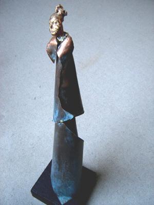 slanke vrouwenfiguur met koperen body en in brons gegoten hoofd. Body voorzien van lichte patina