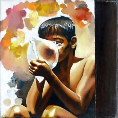 geen apart palet gebruikt;palet direct op doek gezet,en penselen schoongemaakt op doek armoede,honger Ziekte derde-wereld lijm snuiven,portret,