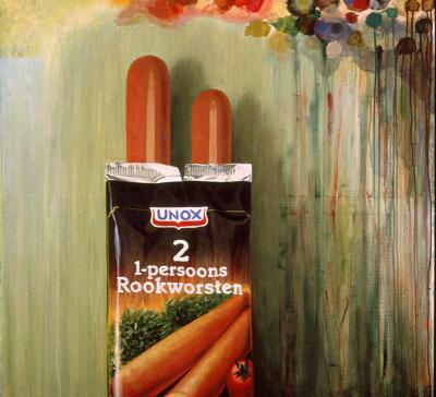 Geen apart palet gebruikt;palet direct op doek gezet,en penselen schoongemaakt op doek relatie realisme-abstractie(fake-expressionisme) recycling;gronstof-product-afval.Recycling.milieuvervuiling.consumptie-,en wegwerpmaatschappij. .materialisme massaproductie.massaconsumptie .marketing.reclame.verpakking Unox rookworst