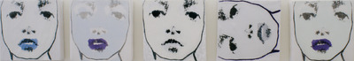 Het gezicht is afgeleid van een Mariastandbeeld, dat ergens aan een rivier in Frankrijk staat. Al eerder, tijdens het project 'Wachten op een wonder, een reizende tentoonstelling'(2006), heeft Marijke Vijfhuizen zich met de vrouw aller vrouwen beziggehouden. U ziet hier 5 gezichtjes van elk 15x15cm, in totaal zijn er 25 gemaakt. Het is een ets op stof met een glansje!