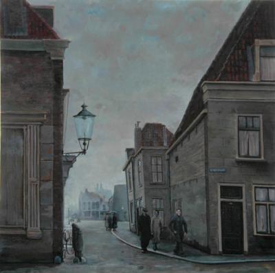 Dit is het eerste schilderij van een serie van 3 van het oude Schiedam rond 1950 Dit schilderij is van de Boterstraat zowat op de plaats waar ik nu woon.