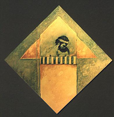 Schilderij van de heilige Marcus uit een serie. Lijden en schoonheid, een in de kunstgeschiedenis vaak gebruikte combinatie. Na afgestudeerd te zijn op schilderijen met de heilige Sebastiaan heb ik de serie jaren later weer opgepakt om een aantal andere heiligen te verkennen. Plat en ruimtelijk, de voorstelling geconcentreerd op een toneel, omlijst door vlakken.