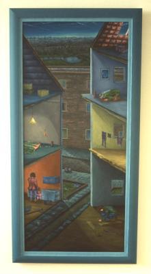 Multi-culturalism on the outskirts of Amsterdam. This Painting portrays different cultural groups living together on the outskirts of the centre of Amsterdam. As one moves away from the centre of Amsterdam the urban landscape changes from old traditional housing to flattopped, concrete, new buildings. The divisions between cultures are also prevalent as one can see pockets of a particular culture living in a particular suburb.
