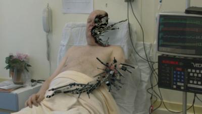 Een still uit de gedeeltelijk geanimeerde fake-documentaire over een ziekte die ontstaat bij mensen met een implantaat in het lichaam. Deze ziekte kan ervoor zorgen dat grote delen van het menselijk lichaam transformeren naar mechanisch ogende constructies.