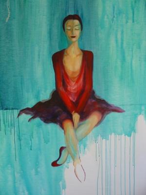 Je transporte la femme dans un monde lointin et mysterieux. Un monde ou la femme est reine... losse doek die op ronde houten balk hangt.