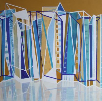 Gebouwen reflecterend in water naar de skyline van verschillende steden. Ze staan als bomen in een dicht bos en daaraan heb ik de titel ontleend.