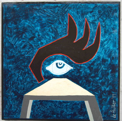Uit de serie Tableflames. De poten van de tafel doorbreken het kader van het schilderij zodat de omgeving erbij betrokken wordt.